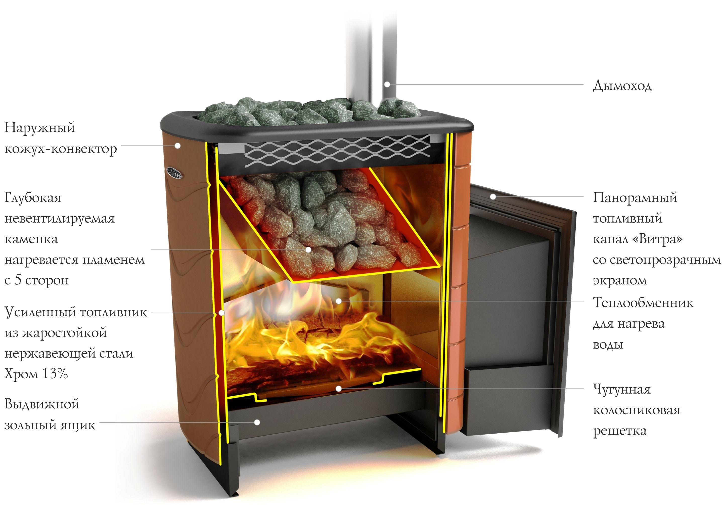 Максимально прогреть парилку в рекордно быстрые сроки позволяет улучшенная схема прохождения конвекционного потока с использованием вентиляционных отверстий на передней панели и специальной сетки по всему периметру печи