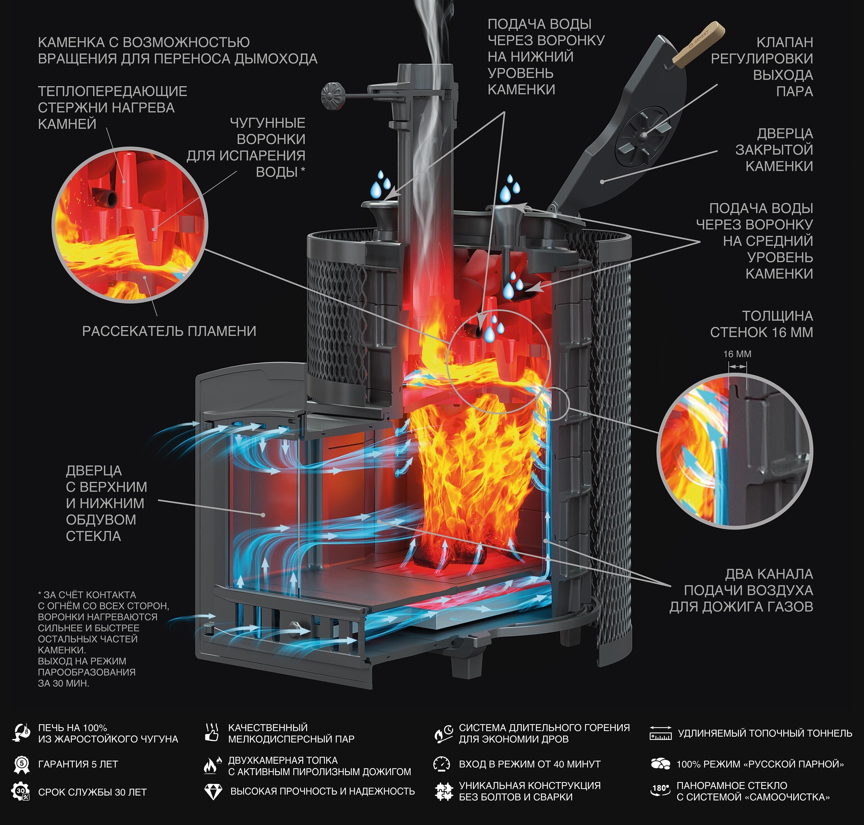 Масса пароиспарителя в печи Аванград 62 кг, и он нагревается прямым контактом с пламенем. У пароиспарителя 2 поверхности с увеличенной рабочей площадью – снизу идёт нагрев огнём, а сверху поддаётся вода для пара. Для увеличения площади испарения и нагрева первых слоёв камней на каменке отлиты высокие шипы.