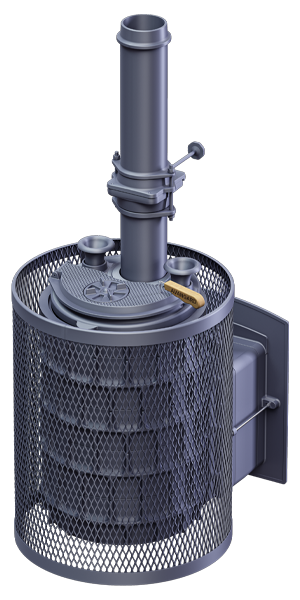Под каменкой на 3-х упорах установлен рассекатель пламени, он разделяет пламя на 3 потока и направляет сначала на боковые части корпуса для интенсивного нагрева стенок и конвекционного нагрева воздуха в парной. Для этого на наружных поверхностях расположены конвекционные рёбра. Дальше пламя проходит через выступы к выходу в дымоход, нагревая каменку.