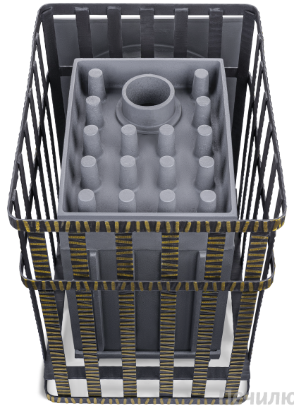 GFS-ЗК в сетке 30 - печь с усиленной каменкой большей массы, с единым углублением внутрь топки для дополнительной укладки чугунного заряда. Теплосъемные шипы, со стороны горения пламени, в разы увеличивают площадь соприкосновения огня с каменкой и ускоряют передачу тепла, а также способствуют лучшему дожигу смешивая потоки пламени и воздуха поступаемого из воздушника. Эти усовершенствования значительно повышают мощность парообразования печи и выдают большее количество пара при непрерывной подаче воды. Каменка печей GFS-ЗК является незаливаемой.