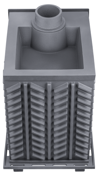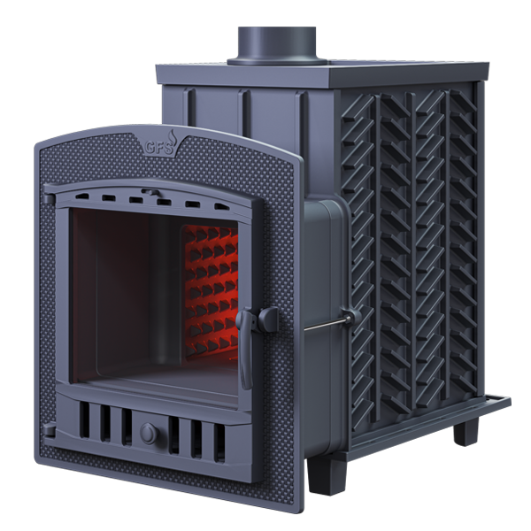 GFS-ЗК 40 (П) - печь с усиленной каменкой большей массы, с единым углублением внутрь топки для дополнительной укладки чугунного заряда. Теплосъемные шипы, со стороны горения пламени, в разы увеличивают площадь соприкосновения огня с каменкой и ускоряют передачу тепла, а также способствуют лучшему дожигу смешивая потоки пламени и воздуха, поступаемого из воздушника. Эти усовершенствования значительно повышают мощность парообразования печи и выдают большее количество пара при непрерывной подаче воды. Каменка печей GFS-ЗК является незаливаемой.