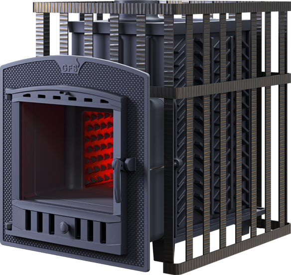 GFS-ЗК в сетке 40(П2) - печь с усиленной каменкой большей массы, с единым углублением внутрь топки для дополнительной укладки чугунного заряда. Теплосъемные шипы, со стороны горения пламени, в разы увеличивают площадь соприкосновения огня с каменкой и ускоряют передачу тепла, а также способствуют лучшему дожигу смешивая потоки пламени и воздуха поступаемого из воздушника. Эти усовершенствования значительно повышают мощность парообразования печи и выдают большее количество пара при непрерывной подаче воды. Каменка печей GFS-ЗК является незаливаемой.