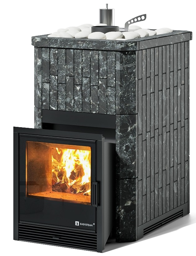 Южная - банная печь с уникальным узлом дожига дымовых газов , который обеспечивает более полное сгорание дров и и, как следствие, снижение расхода дров до 30%. Печь оснащена съемной закрытой каменкой, топка печи футерована шамотными плитами. В стандартную комплектацию печи входит индивидуально разработанный кожух из натурального камня толщиной 40 мм с регулируемой конвекцией.