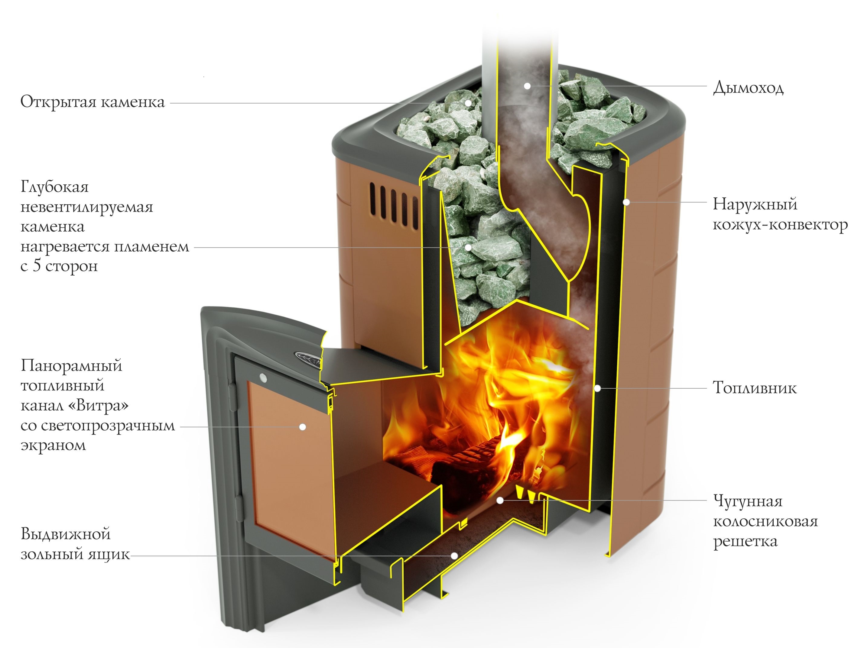 • Нагреваемая с пяти сторон невентилируемая каменка - хороший прогрев камней