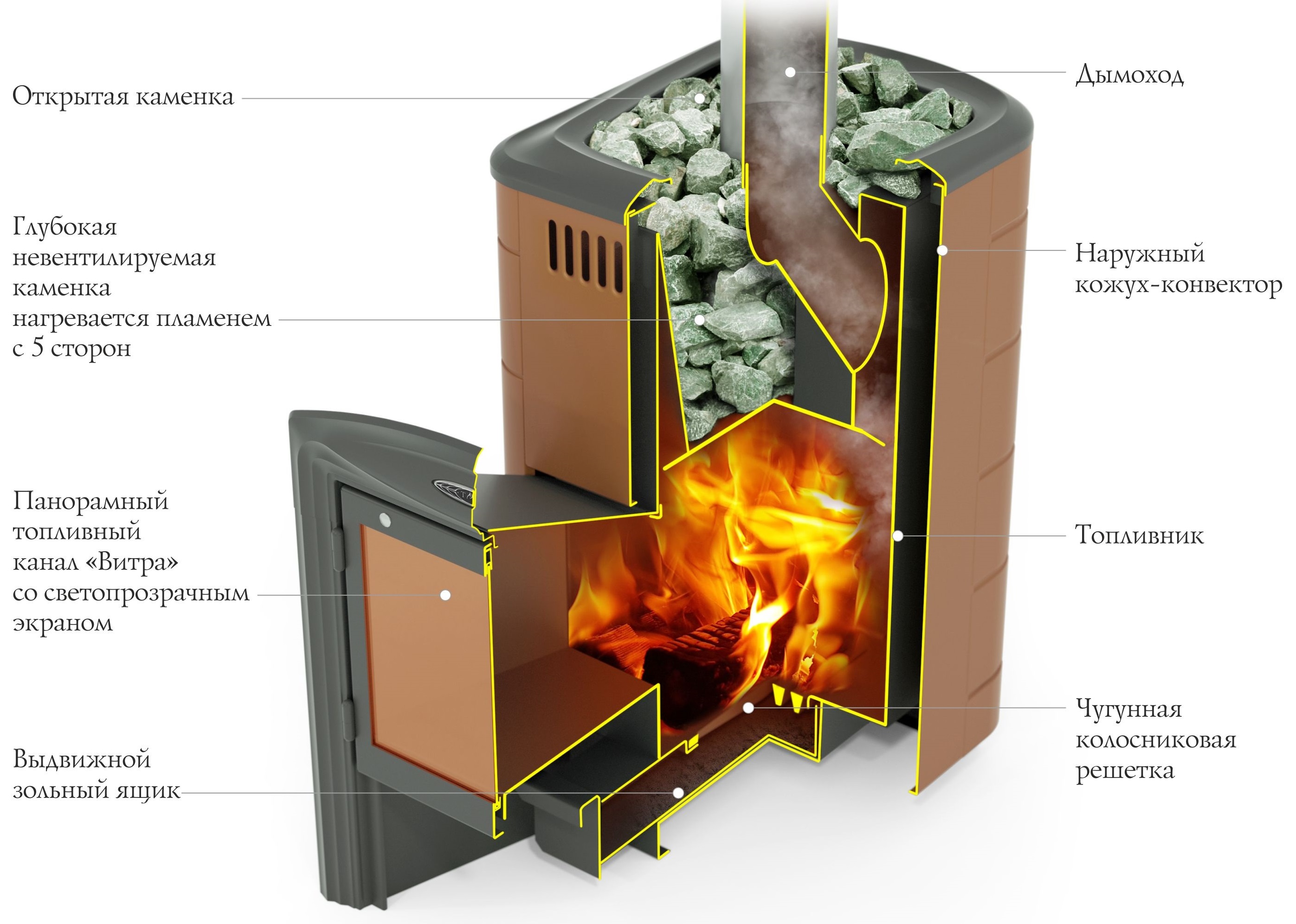 • Нагреваемая с пяти сторон невентилируемая каменка - хороший прогрев камней