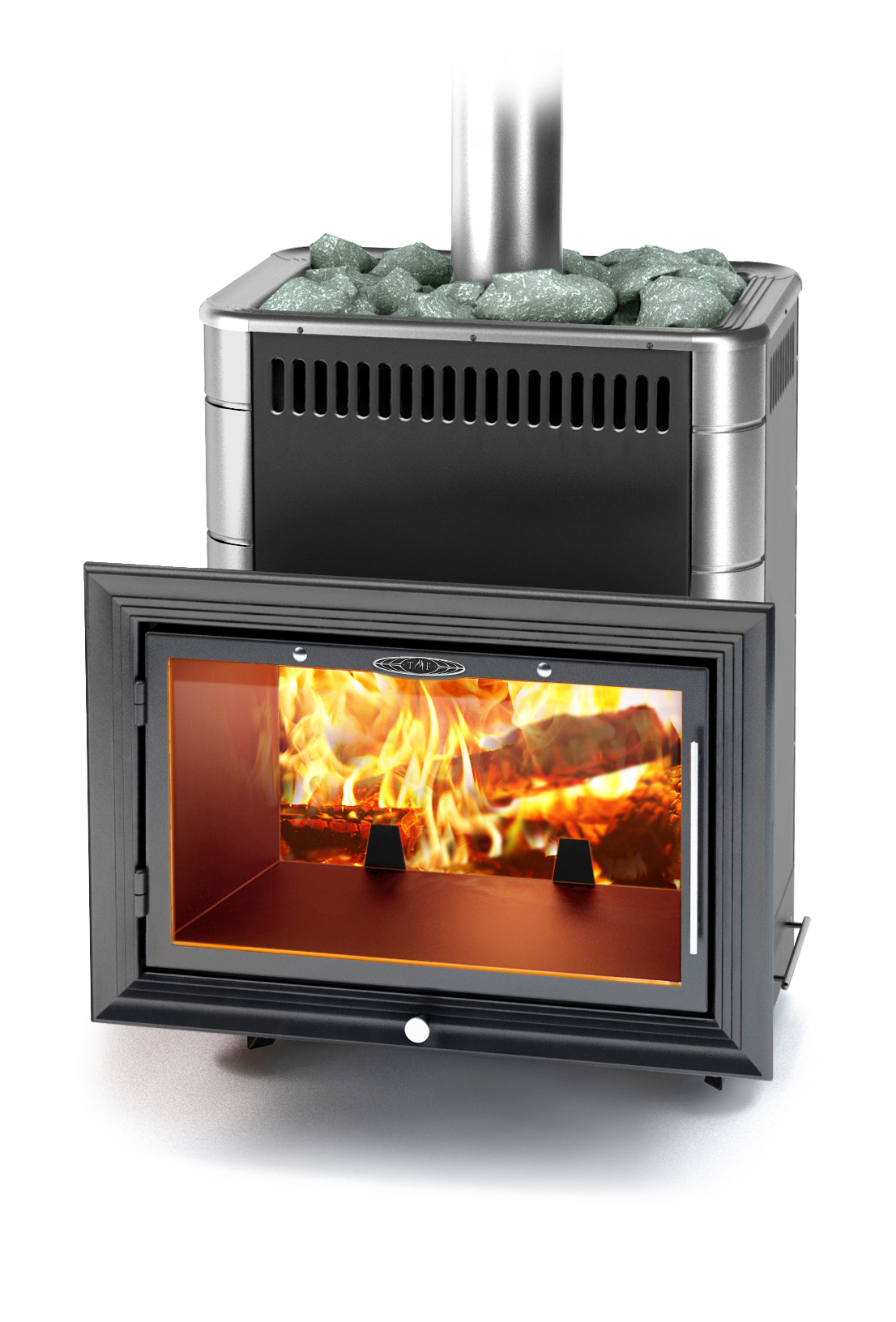 Рекордно большой светопрозрачный экран (его диагональ — 58 см), изготовленный из жаростойкого стекла Schott Robax®, приравнивает эту печь к настоящему большому камину.
