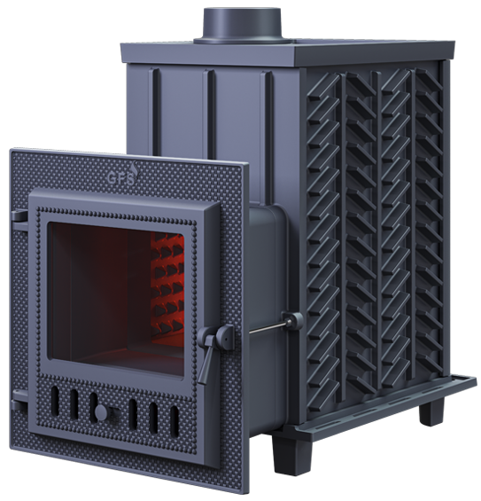 GFS-ЗК 30 (М) - печь с усиленной каменкой большей массы, с единым углублением внутрь топки для дополнительной укладки чугунного заряда. Теплосъемные шипы, со стороны горения пламени, в разы увеличивают площадь соприкосновения огня с каменкой и ускоряют передачу тепла, а также способствуют лучшему дожигу смешивая потоки пламени и воздуха поступаемого из воздушника. Эти усовершенствования значительно повышают мощность парообразования печи и выдают большее количество пара при непрерывной подаче воды. Каменка печей GFS-ЗК является незаливаемой.