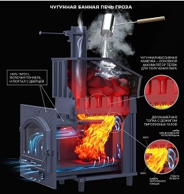 Чугунные банные печи ТМ «Гроза» — это современные печи, рассчитанные на малые и средние размеры парных. Печь имеет прочную сборную конструкцию, без резьбовых и сварных соединений, детали выполнены из легированного чугуна. Топка печей «Гроза» состоит из двух камер, разделенных пламегасителем. Радиаторные выступы каменки, направленные вглубь топки, увеличивают площадь контакта огня с каменкой и эффективность теплосъема. Для увеличения площади поверхности нагрева камней каменка снаружи оборудована чугунными шипами, направленными вверх. Между шипами укладываются банные камни или дополнительные чугунные заклады, такие как ядра и чугунные шишки. Сами чугунные шипы также являются частью заряда для лучшего испарения воды