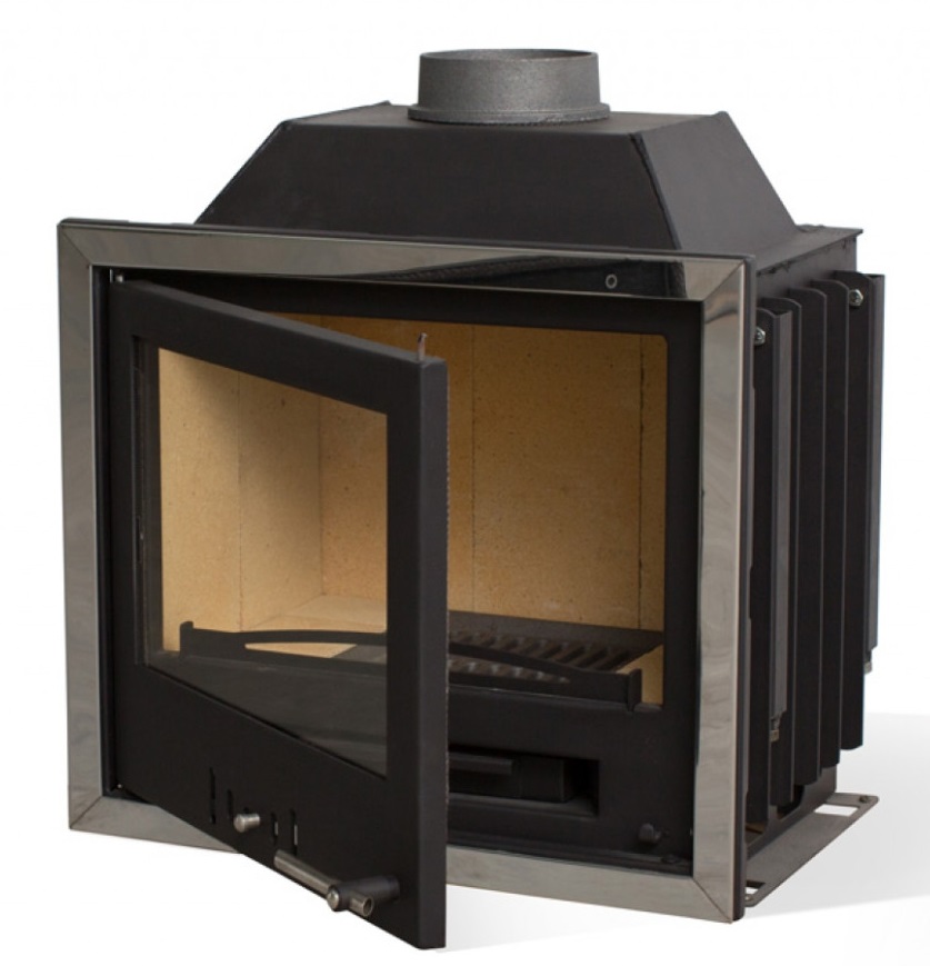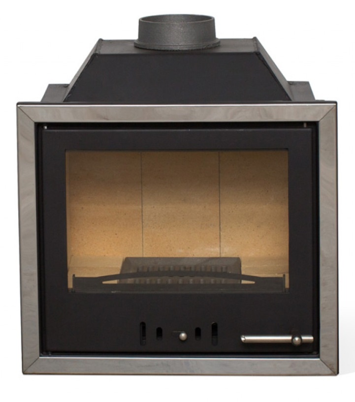 - Компактная каминная топка привлекательного современного дизайна с декоративными элементами из нержавеющей стали.