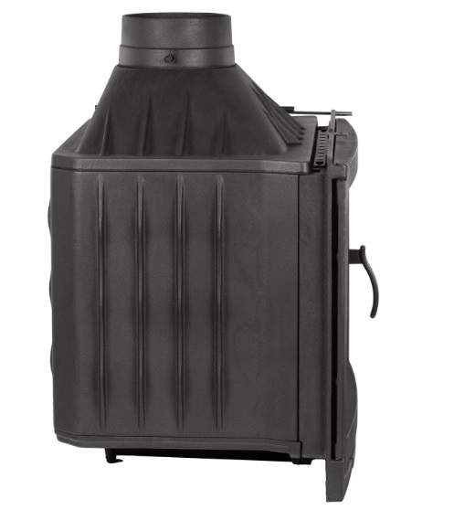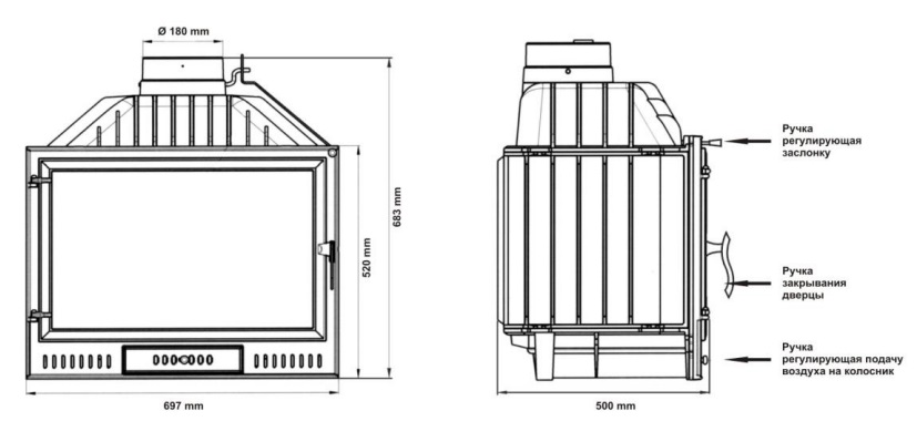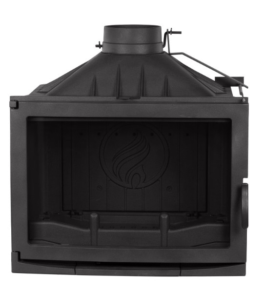в дверце установлено панорамное стекло толщиной 5мм с параметрами 580мм*370мм,предоставляющее великолепный обзор внутренней части топки и обдуваемое потоками воздуха для недопущения оседания копоти и сажи;
