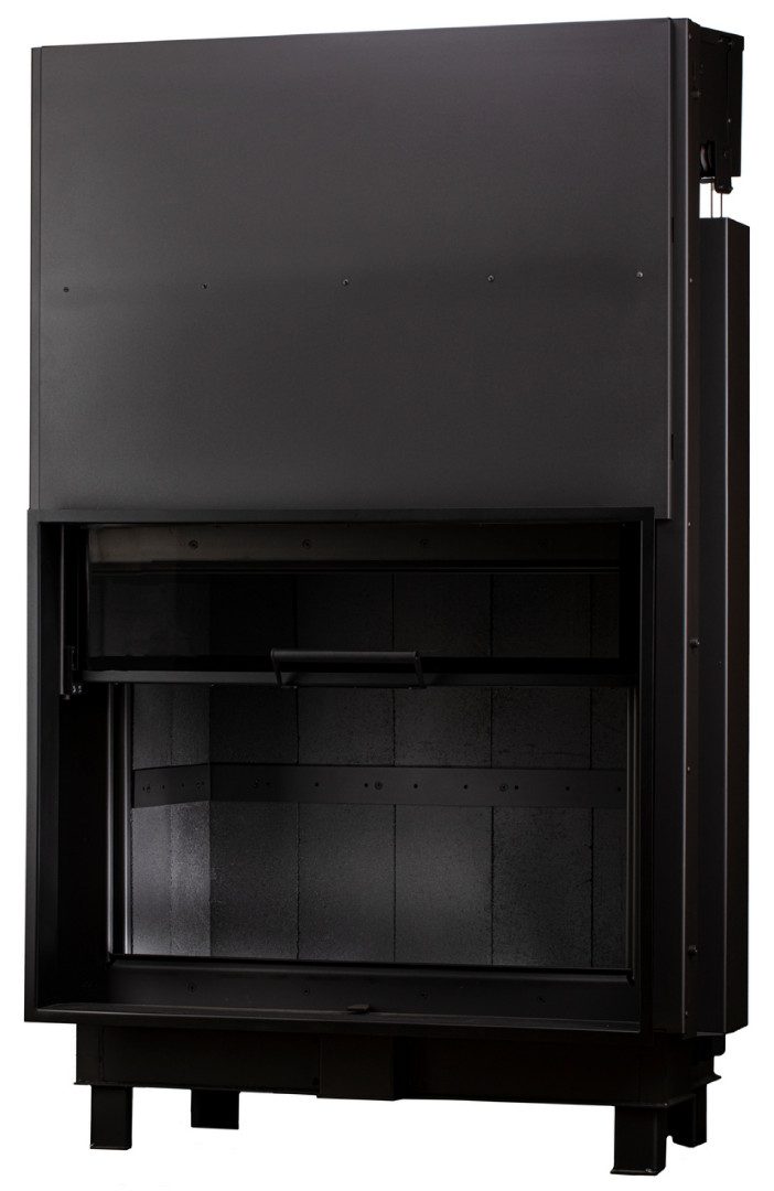 Современная и функциональная топка с плавным и бесшумным подъёмным механизмом дверцы.Дно топки выполнено в виде чаши с бортом и выложено шамотным кирпичом.Задняя и боковые стенки топочной камеры футерованы 3D вермикулитом.Шамот и вермикулит – это природные,экологически чистые материалы,при их нагревании не выделяется запах и токсичные вещества.