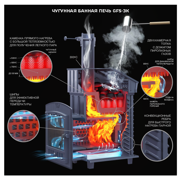 - регулирует температуру в парной за счёт точного контроля конвекции. На дверце облицовки расположена поворотная заслонка, изменяя положении которой можно точно отрегулировать интенсивность конвекционного потока горячего воздуха;