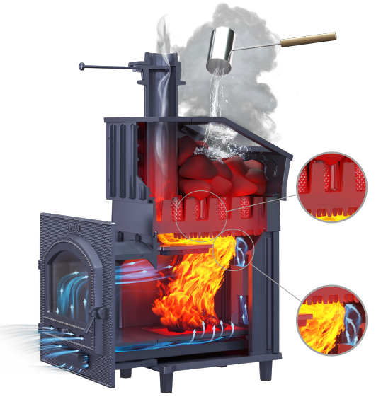 - регулирует температуру в парной за счёт точного контроля конвекции. На дверце облицовки расположена поворотная заслонка, изменяя положении которой можно точно отрегулировать интенсивность конвекционного потока горячего воздуха;
