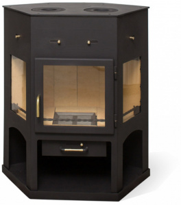 - Пристенно-угловая модель с универсальным подключением дымохода (заднее и верхнее).