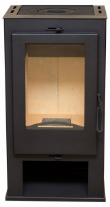 Компактная пристенная печь. Идеально подходит для обогрева небольшого загородного домика площадью 30-60 м2. Верхняя панель оборудована чугунной варочной плитой. Кроме обогрева помещения можно разогреть пищу или вскипятить чайник. Боковые панели окрашены в серый цвет. Размер поленьев 25 -27 см. Подсоединение к дымоходу сзади. Диаметр заглушки внешний 12 см, внутренний 9 см. Диаметр кольца внешний 18 см, внутренний 15 см.